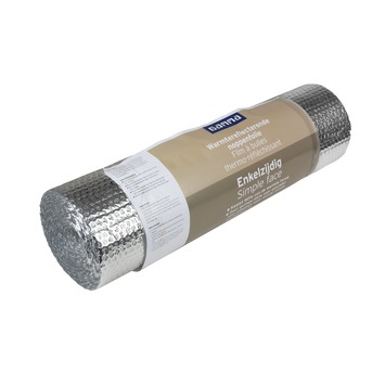 GAMMA noppenfolie enkelzijdig reflecterend 6meter 60cm, 3,6m² beschermt en isoleert. De aluminium noppenfolie reflecteert kou of warmte en is daardoor een fijn isolatiemateriaal dat bescherming biedt tegen temperatuurschommelingen. De folie werkt warmteisolerend en energiebesparend. Met de GAMMA noppenfolie vervoer je bijvoorbeeld ook materiaal dat gevoelig is voor warmte of kou. Bovendien is de noppenfolie winddicht en bestand tegen vocht. Je verwerkt GAMMA noppenfolie eenvoudig door het op het te bevestigen oppervlak te spijkeren of nieten.