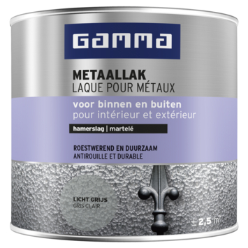 GAMMA metaallak is een roestwerende metaallak met hamerslageffect op terpentinebasis. Kan direct op de ondergrond worden aangebracht, zonder deze eerst voor te behandelen met een grondverf. Geschikt voor het schilderen van metalen hekwerken en meubels, maar kan ook op hout worden toegepast. Binnen en buiten te gebruiken.