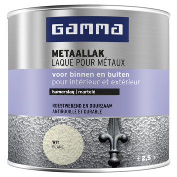 GAMMA metaallak is een roestwerende metaallak met hamerslageffect op terpentinebasis. Kan direct op de ondergrond worden aangebracht, zonder deze eerst voor te behandelen met een grondverf. Geschikt voor het schilderen van metalen hekwerken en meubels, maar kan ook op hout worden toegepast. Binnen en buiten te gebruiken.