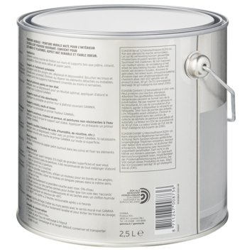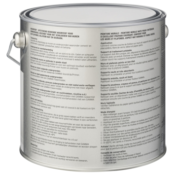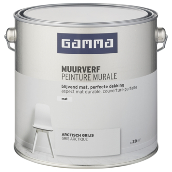 De GAMMA muurverf voor binnenshuis is geschikt voor het schilderen van muren en plafonds. De GAMMA muurverf arctisch grijs mat 2,5 L is een geur arme watergedragen muurverf. Het blik heeft een inhoud van 2,5 liter, dit is voldoende voor een oppervlakte van ongeveer 20 m². Twee uur na het aanbrengen van de verf is deze reeds stofdroog, na 6 uur kan je de volgende laag aanbrengen. De beste temperatuur om met deze verf te werken is tussen de 8 en 25°C. Met zijn uitstekende dekking is de verf zeer geschikt als afwerklaag op verschillende ondergronden, waaronder cement- en pleisterwerk, gipsplaat, glasweefsel, beton en behang.