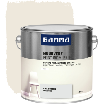 GAMMA muurverf RAL 9001 fine cotton mat 2,5 liter is perfect voor het schilderen van muren en plafonds in je woning. Deze watergedragen verf heeft een inhoud van 2,5 liter, wat voldoende is voor het dekken van een oppervlakte van ongeveer 20 m². De verf droogt snel; na twee uur is deze al stofdroog en na zes uur kun je een nieuwe laag aanbrengen. De ideale verwerkingstemperatuur ligt tussen de 8 en 25°C. Dankzij de uitstekende dekking is de verf geschikt voor diverse ondergronden, zoals cement, pleisterwerk, gipsplaat, glasweefsel, beton en behang.