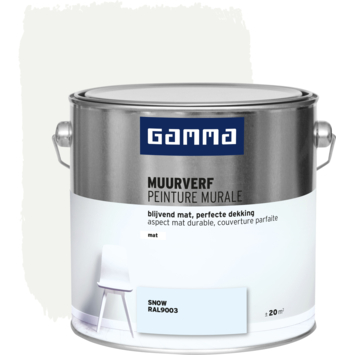 GAMMA muurverf RAL 9003 snow mat 2,5 liter is perfect voor het schilderen van muren en plafonds in je woning. Deze watergedragen verf heeft een inhoud van 2,5 liter, wat voldoende is voor het dekken van een oppervlakte van ongeveer 20 m². De verf droogt snel; na twee uur is deze al stofdroog en na zes uur kun je een nieuwe laag aanbrengen. De ideale verwerkingstemperatuur ligt tussen de 8 en 25°C. Dankzij de uitstekende dekking is de verf geschikt voor diverse ondergronden, zoals cement, pleisterwerk, gipsplaat, glasweefsel, beton en behang.