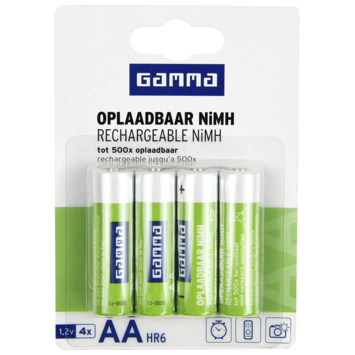 De GAMMA oplaadbare batterij AA NiMH 2400 mAh 4 stuks is een handige set batterijen die bestaat uit vier stuks. De batterijen zijn oplaadbaar en kunnen dus vele malen hergebruikt worden. De herlaadbare batterijen hebben een heel hoge capaciteit van 2400 mAh en gaan dus lang mee. Met een AA formaat behoort deze GAMMA batterij AA herlaadbaar 4 stuks tot de categorie penlite.