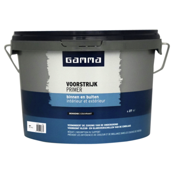 GAMMA primer dekkend wit 2,5 liter voor binnen en buiten is een dekkende primer voor ondergronden die worden geschilderd met plafond- of muurverf. Vermindert de zuiging van de ondergrond, geeft een betere dekking en hechting van de verf en voorkomt kleur en glansverschillen van de eindlaag. De watergedragen primer is sneldrogend. Voor binnen- en buitengebruik.