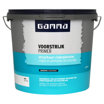 GAMMA primer structuur en sierpleister wit 5 liter is een dekkende primer met een fijne structuur. Voor muren en plafonds die worden afgewerkt met structuurverf, structuurpleister of korrelpleister. Zorgt voor een uitstekende hechting van de eindlaag. Ook vermindert het de zuiging van de ondergrond. De watergedragen primer is sneldrogend. Voor binnengebruik.