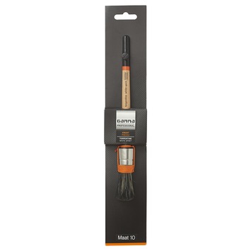 De GAMMA Professional borstel rond voor solventgedragen verf maat 10 is een ronde verfborstel die je gebruikt voor verf op solventbasis. Met een breedte van 10 millimeter is deze borstel geschikt voor precieze schilderklussen zoals smalle randen, profielen of kleine oppervlakken. Je kan hem gebruiken op gladde en ruwe ondergronden zoals hout, metaal en kunststof. De haren zijn een mix van natuurlijk en synthetisch materiaal en zorgen voor een goede opname van de verf en een gelijkmatige afwerking zonder haarverlies. De houten steel ligt stevig in de hand en de haren zitten vast in een roestvrije metalen bus waardoor je de borstel meermaals kan gebruiken. Je gebruikt deze verfborstel voor vernis, beits of muurverf op solvent- of oliebasis.
