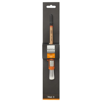 De GAMMA Professional lakborstel rond voor watergedragen verf maat 8 is een ronde borstel die je gebruikt met verf op waterbasis. Met een diameter van 8 mm is ze geschikt voor detailwerk en het schilderen van kleine oppervlakken. De borstel kan gebruikt worden op hout kunststof en metaal en dat kan zowel op gladde als ruwe ondergronden. De synthetische haren nemen veel verf op en geven die egaal af zodat je gelijkmatig kunt schilderen. De haren vallen niet uit en zijn eenvoudig te reinigen waardoor je de borstel vaker kunt hergebruiken. De roestvrijstalen bus houdt de haren stevig vast en maakt de borstel extra sterk.