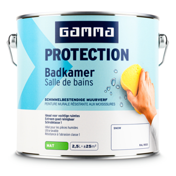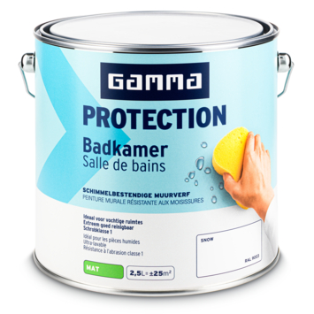 Met GAMMA Protection badkamer muurverf snow RAL 9003 mat 2,5 liter schilder je muren die dagelijks te maken krijgen met vocht en temperatuurschommelingen. Deze verf is door GAMMA ontwikkeld met een Protection technologie die een beschermende laag vormt. Die laag helpt schimmelvorming tegen te gaan en maakt de muur beter bestand tegen intensief gebruik in de badkamer.