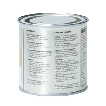 De GAMMA radiatorlak hoogglans 250 ml gebroken wit is een glanzende, waterverdunbare lak voor binnen. Het is speciaal geschikt voor de bescherming van radiatoren, centrale verwarmingsleidingen en warmwaterleidingen. GAMMA radiatorlak is watergedragen en bestand tegen temperaturen tot ca. 80°C. De lak is geurarm en snel droog waardoor je de radiatorlak probleemloos binnenshuis kunt gebruiken. Voor het beste resultaat adviseren wij de ondergrond voor te behandelen met GAMMA grondverf/primer metaal. Het blik heeft een inhoud van 250 ml en dit is geschikt om een oppervlak van +/- 4 m2 te lakken.