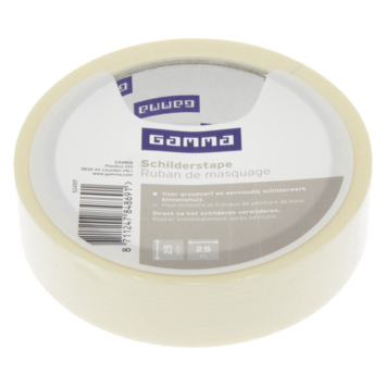 De GAMMA schilderstape 25 mm x 25 m is een afplaktape die je binnenshuis gebruikt en die geschikt is voor vlakke ondergronden. De tape is gemaakt van papier waardoor hij eenvoudig te gebruiken is tijdens schilderwerken. Je kan de tape makkelijk met de hand afscheuren zodat je snel een stuk op maat hebt. Na het schilderen verwijder je de tape onmiddellijk zodat de ondergrond proper blijft en je werk netjes afgewerkt is.