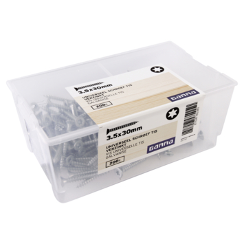 Deze platkopschroeven van GAMMA zijn gemaakt van verzinkt staal en universeel te gebruiken. De schroef is van het type T15, met een platverzonken kop en een torx-aandrijving. De schroef heeft draad over de hele lengte, en geeft daarmee veel grip in de materie. De voldraadschroef is voorzien van een waslaag voor een betere verwerking. De verpakking bevat schroeven met een lengte van 30mm en een diameter van 3,5mm. De schroeven zijn zowel binnen als buiten te gebruiken in spaanplaat en hout. Eén verpakking bevat 200 stuks.