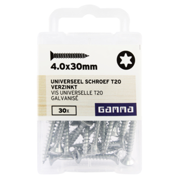 Deze platkopschroeven van GAMMA zijn gemaakt van verzinkt staal en universeel te gebruiken. De schroef is van het type T20, met een platverzonken kop en een torx-aandrijving. De schroef heeft draad over de hele lengte, en geeft daarmee veel grip in de materie. De voldraadschroef is voorzien van een waslaag voor een betere verwerking. De verpakking bevat schroeven met een lengte van 30mm en een diameter van 4mm. De schroeven zijn zowel binnen als buiten te gebruiken in spaanplaat en hout. Eén verpakking bevat 30 stuks.