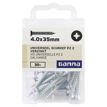 Deze schroeven van GAMMA zijn gemaakt van verzinkt staal en universeel te gebruiken. Ze hebben een platverzonken kop van het type PZ 2 en een pozi-aandrijving. Je kan deze standaardschroeven dus gebruiken met een kruiskopschroevendraaier. De schroef heeft draad over de hele lengte, en heeft daarmee veel grip in de materie. De voldraadschroef is voorzien van een waslaag voor een betere verwerking. De schroeven hebben een lengte van 35mm en een diameter van 4mm. Ze zijn zowel binnen als buiten te gebruiken in spaanplaat en hout. Eén verpakking bevat 30 stuks.