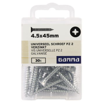 Deze platkopschroeven van GAMMA zijn gemaakt van verzinkt staal en universeel te gebruiken. Ze hebben een platverzonken kop van het type PZ 2 en een pozi-aandrijving. Je kan deze standaardschroeven dus gebruiken met een kruiskopschroevendraaier. De schroef heeft draad over de hele lengte, en biedt daarmee veel grip in de materie. De voldraadschroef is voorzien van een waslaag voor een betere verwerking. De schroeven hebben een lengte van 45mm en een diameter van 4,5mm. Ze zijn zowel binnen als buiten te gebruiken in spaanplaat en hout. Eén verpakking bevat 30 stuks.