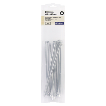 Deze platkopschroeven van GAMMA zijn gemaakt van verzinkt staal en universeel te gebruiken. De schroef is van het type T25, met een platverzonken kop en een torx-aandrijving. Je kan de schroef dus goed indraaien met een torx-schroevendraaier. De deeldraadschroef is voorzien van een waslaag voor een betere verwerking. De verpakking bevat schroeven met een lengte van 140mm en een diameter van 6mm. De schroeven zijn zowel binnen als buiten te gebruiken in spaanplaat en hout. Eén verpakking bevat 12 stuks.