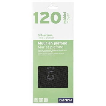 Het schuurgaas muur en plafond 120 van GAMMA bestaat uit drie kwalitatief hoogwaardige schuurgazen en is geschikt om oneffenheden op gips(platen), gasbetonblokken en pleisterwerk te verwijderen of reparatiemiddelen glad te schuren. Goed om te weten: dit gaas heeft een middelgrove structuur. Daarnaast kan het gaas tweezijdig, nat en droog gebruikt worden én gaat het 3 keer langer mee dan gewoon schuurpapier. De afmeting van het gaas is 11,5 op 28 centimeter.