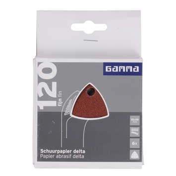 Het GAMMA schuurpapier 93x90mm is geschikt voor het schuren van houten en behandelde oppervlakken. Dit schuurpapier heeft korrelgrootte K120 (fijn). Het schuurpapier bevat klittenband en is geschikt voor een deltaschuurmachine. De verpakking bevat 6 vellen.