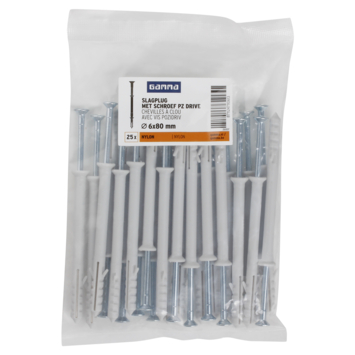 De GAMMA Slagplug nylon Ø 6x80mm met schroef is geschikt voor toepassing op verschillende soorten materialen zoals beton, wandverbinding en metaal. Nagelpluggen zijn zeer geschikt voor het monteren van houten regelwerk (zoals plinten). De werkwijze is anders dan bij een gewone plug en daarom is deze plug ook wel bekend als spijkerplug of nagelplug. Je slaat de plug namelijk met een hamer in het boorgat. Gebruik voor het boren van het gat een boor met een doorsnede van 6mm. De plug is 80mm lang. Bijpassende schroeven zijn 85mm lang en hebben een doorsnede van Ø 3,7 mm. Een verpakking bevat 25 slagpluggen.