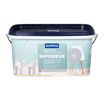 De GAMMA Superieur matte muurverf is een kwalitatief hoogwaardige, uitstekend dekkende en zeer goed afwasbare watergedragen verf. De matte muurverf in de kleur beton (5 liter) zorgt voor een egale en gladde afwerking, die nog versterkt wordt dankzij het gebruik van kwalitatief verfgereedschap. De verf is universeel toepasbaar voor het schilderen van muren en plafonds in je living, slaapkamer, hal maar ook garages en kelders. Ook buiten te gebruiken voor het schilderen van muren en gevels. Met deze verf haal je een ademende, weersbestendige, reukarme én spatarme verf in huis.