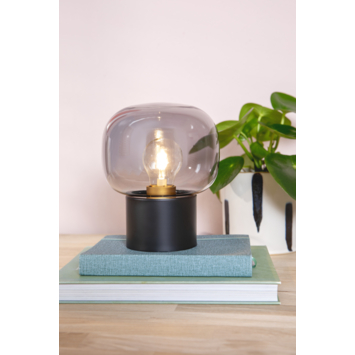 De tafellamp Lille van GAMMA meet 19 cm in hoogte en heeft een diameter van 16 cm. Het bijbehorende snoer heeft een lengte van 180 cm. De lampenkap is vervaardigd van rookglas en is aangevuld met zwarte accenten. Deze specifieke tafellamp is ontworpen om uitsluitend te werken met een E27 lamp.