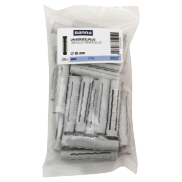 De GAMMA Universeelplug HDPE Ø 10mm is voor meerdere materialen te gebruiken. De plug is zowel geschikt voor beton, massieve als geperforeerde steen, en ook voor holle wanden. De kop van de plug wordt namelijk door de schroef naar achteren getrokken en vormt in holle bouwmaterialen een soort knoop. Een handige plug dus om op voorraad te hebben, zodat je altijd een geschikte plug in huis hebt. De plug is 50mm lang, voor het beste resultaat adviseren wij een minimale boordiepte te hanteren van 60mm . Een verpakking bevat 25 pluggen. Deze plug is geschikt voor schroeven tussen 6 en 8mm met een minimale lengte van 55mm.