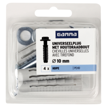 De GAMMA Universeelplug HDPE Ø 10mm met houtdraadbout is voor meerdere materialen te gebruiken. De plug is zowel geschikt voor beton, massieve als geperforeerde steen, en ook voor holle wanden. De kop van de plug wordt namelijk door de schroef naar achteren getrokken en vormt in holle bouwmaterialen een soort knoop. Een handige plug dus om op voorraad te hebben, zodat je altijd een geschikte plug in huis hebt. De plug is 50mm lang, voor het beste resultaat adviseren wij een minimale boordiepte te hanteren van 60mm . Een verpakking bevat 4 pluggen met 0 55mm