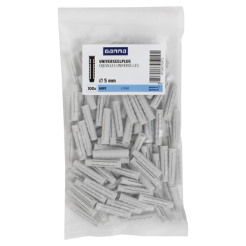 De GAMMA Universeelplug HDPE Ø 5mm is voor meerdere materialen te gebruiken. De plug is zowel geschikt voor beton, massieve als geperforeerde steen, en ook voor holle wanden. De kop van de plug wordt namelijk door de schroef naar achteren getrokken en vormt in holle bouwmaterialen een soort knoop. Een handige plug dus om op voorraad te hebben, zodat je altijd een geschikte plug in huis hebt. De plug is 25mm lang, voor het beste resultaat adviseren wij een minimale boordiepte te hanteren van 30mm . Een verpakking bevat 100 pluggen. Deze plug is geschikt voor schroeven tussen 2,5 en 3,5mm met een minimale lengte van 30mm.