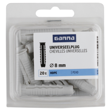 De GAMMA Universeelplug HDPE Ø 8mm is voor meerdere materialen te gebruiken. De plug is zowel geschikt voor beton, massieve als geperforeerde steen, en ook voor holle wanden. De kop van de plug wordt namelijk door de schroef naar achteren getrokken en vormt in holle bouwmaterialen een soort knoop. Een handige plug dus om op voorraad te hebben, zodat je altijd een geschikte plug in huis hebt. De plug is 40mm lang, voor het beste resultaat adviseren wij een minimale boordiepte te hanteren van 45mm . Een verpakking bevat 20 pluggen. Deze plug is geschikt voor schroeven tussen 4 en 6mm met een minimale lengte van 45mm.