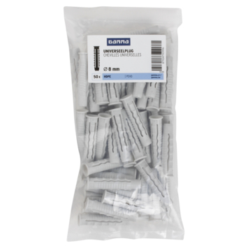 De GAMMA Universeelplug HDPE Ø 8mm is voor meerdere materialen te gebruiken. De plug is zowel geschikt voor beton, massieve als geperforeerde steen, en ook voor holle wanden. De kop van de plug wordt namelijk door de schroef naar achteren getrokken en vormt in holle bouwmaterialen een soort knoop. Een handige plug dus om op voorraad te hebben, zodat je altijd een geschikte plug in huis hebt. De plug is 40mm lang, voor het beste resultaat adviseren wij een minimale boordiepte te hanteren van 45mm . Een verpakking bevat 50 pluggen. Deze plug is geschikt voor schroeven tussen 4 en 6mm met een minimale lengte van 45mm.
