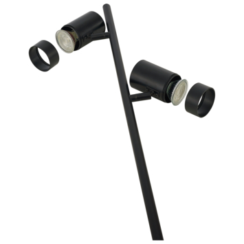 De vloerlamp Pepijn is een elegante vloerlamp met een formaat van 150 cm hoog, gemaakt van metaal in de kleur zwart. De vloerlamp is geschikt voor 2 lichtbronnen met een maximale wattage van 2x25 watt met een GU10 fitting. De lampen zijn richtbaar. De vloerlamp wordt geleverd exclusief lichtbron.