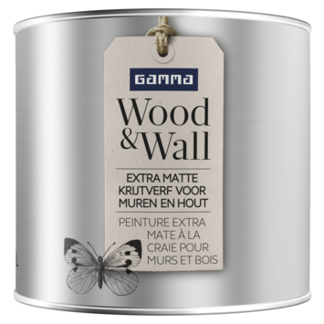 GAMMA Wood&Wall is een zeer matte krijtverf met een verfijnde uitstraling en een geheel eigen effect. Het poedermatte effect komt tot in de kleinste detail tot zijn recht. GAMMA Wood&Wall geeft uw huis de cottagesfeer van de Engelse countryside. De matte krijtverf is op acrylbasis en geschikt voor zowel binnenmuren als houten meubels. De matte krijtverf is afwasbaar, reukarm en niet vergelend.