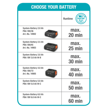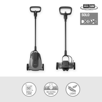 De HandyMower 22 / 18V P4A solo wordt geleverd zonder accu en oplader. Hij is compatibel met alle 18V-accu's van de POWER FOR ALL ALLIANCE, een van de grootste merkoverschrijdende accu-allianties van toonaangevende fabrikanten. Deze accu's kunnen worden gebruikt voor tal van apparaten in huis en tuin. U bespaart dus geld en blijft flexibel! Koop je het product liever met het accusysteem? Geen probleem - dan is de gebruiksklare set de juiste keuze voor jou.