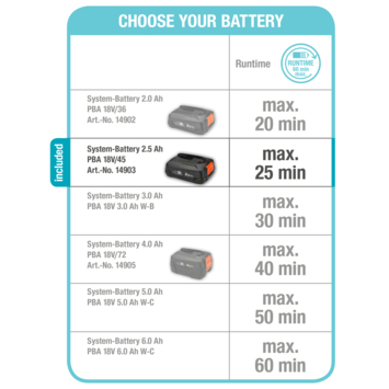 De HandyMower 22 / 18V P4A wordt geleverd als een gebruiksklare set met een oplader en een 2,5 Ah 18V POWER FOR ALL-accu. De POWER FOR ALL ALLIANCE is een van de grootste merkoverschrijdende accu-allianties van toonaangevende fabrikanten. Dit betekent dat de accu's compatibel zijn met tal van andere apparaten in huis en tuin, zodat u er niet langer voor elk product een hoeft te kopen. U bespaart geld en blijft flexibel!