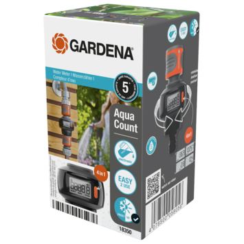 De GARDENA AquaCount maakt bewateren slimmer. De digitale watermeter meet het waterverbruik per cyclus, dag en seizoen. Ook de actuele doorstroomsnelheid zie je live op de grote, draaibare display. Hij werkt op de meegeleverde batterij en is in elke positie te gebruiken – op de kraan of op het uiteinde van de slang. Het filter maak je makkelijk schoon, en dankzij het uv- en vorstbestendige materiaal laat je ‘m gerust buiten hangen. GARDENA geeft 5 jaar fabrieksgarantie.