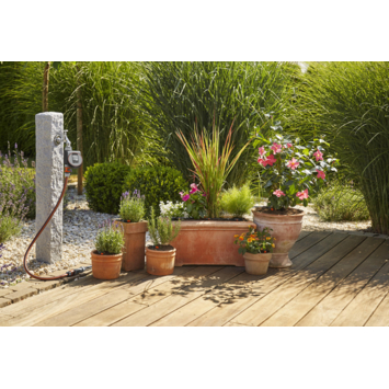 De Gardena besproeiingscomputer Flex Control is bedoelt voor irrigatie op balkons, dakterrassen of patio's. Je sluit het apparaat direct aan op de kraan. De bediening van het apparaat is ook zeer eenvoudig door de roterende knop en de goed leesbare display. Je kan de sproeicycli seconden nauwkeurig instellen, hierdoor kan je de Gardena besproeiingscomputer Flex Control ook gebruiken als druppelsysteem. Het is mogelijk om de computer te combineren met de Gardena bodemvochtigheidssensor.