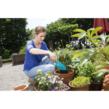 Het Classic tuinschepje van Gardena is het ideale hulpmiddel voor het planten en verplanten in smalle bloembakken, kleine bloempotten en bloemperken. Het schepje is voorzien van een ergonomisch gevormde handgreep die perfect in de hand past. De hoek aan het einde voorkomt wegglijden. Het schepje heeft een breedte van 8 cm en is gemaakt van hoogwaardig staal en een duroplast coating voor extra lange levensduur. Ook beschikbaar in een breedte van 6 cm.