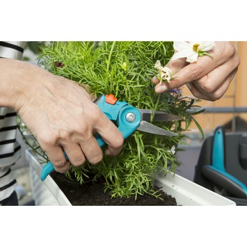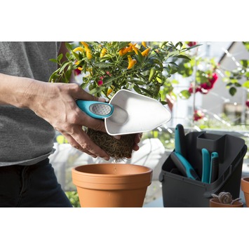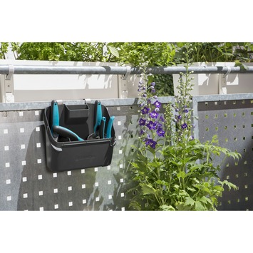 De GARDENA Balkon Box is de ideale set voor balkons en terrassen. De set bevat een schepje, een allesknipper, een handborstel en een harkje. Al deze tools zitten in een kunststof opbergbox, die tevels als blik kan fungeren. Deze set bevat alle tools om het balkon en terras netjes te onderhouden.