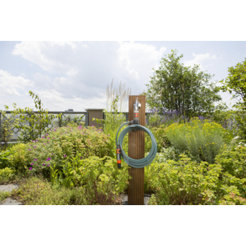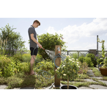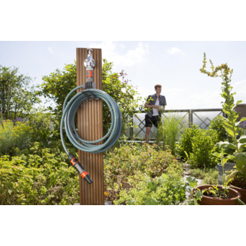 De GARDENA Terras Spiraalslang is de ideale oplossing voor het bewateren van dakterrassen of balkons. Deze tuinslang keert na gebruik altijd terug in zijn oorspronkelijke vorm waardoor op- of afwikkelen niet nodig is. De geïntegreerde houder bespaart ruimte en zorgt ervoor dat de tuinslang op elk moment klaar is voor gebruik. De spiraalslang wordt geleverd als complete set met kraanstuk en sproeikop.