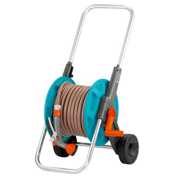 De Gardena wandslanghouder 50 compleet is een handige wagen met tuinslang die je zowel aan de muur kan bevestigen, als mobiel gebruiken in de tuin. Het onderstel is speciaal vormgegeven voor goede stabiliteit en makkelijke verplaatsing. De slangenwagen bestaat uit een 20 meter tuinslang van 13 mm diameter, een tuinspuit en een aansluitstuk. Exclusief koppelstuk voor de kraan. Ook montagestukken zijn bijgeleverd. De slangenwagen is voorzien van een meedraaiende aansluitas, zodat de slang niet verdraait of knikt bij het op- en afrollen. De geïntegreerde druppelstop voorkomt weglopen van water na gebruik. De waterstraal is traploos regelbaar van volle straal tot fijne sproeinevel. Kortom, de Gardena wandslanghouder 50 compleet is de ideale set voor het besproeien van de tuin en andere huishoudelijke klussen.