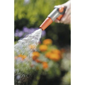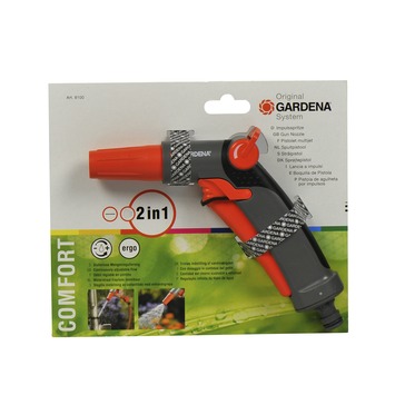 Het Gardena Comfort spuitpistool is een handige sproeikop om te reinigen en besproeien. De waterstraal is traploos regelbaar van volle straal tot fijne sproeinevel. Ook de hoeveelheid water kan je naar behoefte doseren. De zachte kunststof onderdelen bieden extra comfort en zorgen ervoor dat de spuit niet wegglijdt. De ergonomische impulsgreep kan je ook vastzetten zodat je kan sproeien zonder dat je de knop ingedrukt hoeft te houden. Het Gardena Comfort spuitpistool is dus een lichte sproeier waar je prettig mee kan werken.