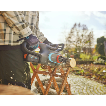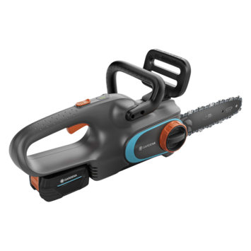 Krijg een krachtige en precieze zaagsnede met GARDENA's accu 18V kettingzaag. Uitgerust met Oregon® ketting en zaagblad aangedreven door een borstelloze motor en 18V P4A accu (apart verkrijgbaar), is deze compacte kettingzaag ideaal voor hobbytuinieren, boomverzorging en brandhout zagen. Kracht en precisie in je handen Een goede kettingzaag heeft de juiste combinatie van kracht en precisie nodig, en deze snoerloze accu kettingzaag heeft slimme functies om beide te bieden. De geluidsarme borstelloze motor op batterijen biedt een kettingsnelheid van 8 m/s om korte metten te maken met bomen, boomstammen en takken met een ¿"" ketting en 25 cm kettingblad van Oregon®, een van 's werelds meest vertrouwde merken sinds 1947, internationaal bekend om hun lange levensduur en betrouwbaarheid naast optimale zaagprestaties. Natuurlijk is ruw vermogen alleen niet genoeg om houtbewerking van hoge kwaliteit te garanderen. Deze Oregon® zaagketting is ideaal voor hobbytuiniers die de GARDENA kettingzaag PowerSaw 250/18V kleine zagen met een laag vermogen gebruiken, omdat de ketting efficiënter werkt. Het 0,043 gauge smalle zaagsnedesysteem verhoogt de efficiëntie en vraagt minder vermogen van de zaag dan standaard zaagsystemen. De trillingsarme, terugslagvrije beitelfrees is ontworpen voor hobbytuiniers en levert uitstekende prestaties. Ook geschikt voor andere kettingzaagmodellen die werken met 3/8"" low-profile steek, 1,1 mm (0,043"") gauge. Zagen met comfort en gemak Zware handzagen kunnen inspannend zijn om te gebruiken, vooral bij grotere klussen. Daarom is de GARDENA kettingzaag ergonomisch ontworpen voor het comfort van de gebruiker. De speciaal ontworpen handgreep maakt meerdere zaagtoepassingen mogelijk, van tuinieren en boomverzorging tot brandhoutvoorbereiding. Met slechts 3,8 kg is het een lichtgewicht gereedschap, ondanks de zaagkracht. En omdat hij op een accu werkt, heb je niet het lawaai, de uitstoot en de geuren van kettingzagen op benzine. Ontworpen met jouw veiligheid in gedachten Veilig zagen is onze topprioriteit. Daarom zit de 18V kettingzaag van GARDENA vol met intelligente veiligheidsfuncties die zijn ontworpen rond de meest voorkomende oorzaken van ongelukken en letsel. Het Oregon® kettingblad heeft een krachtige kettingrem om de veiligheid te handhaven als het zagen wordt onderbroken. De ¾"" ketting wordt ondersteund door een robuuste metalen kettingvanger om de ketting op zijn plaats te houden in het zeldzame geval dat hij breekt. Minimaal onderhoud Dit gereedschap is ontworpen met het oog op minimaal onderhoud. Toolless kettingspanning zorgt voor een optimale zaagsnede zonder dat je de ketting handmatig hoeft te spannen. De borstelloze motor is ontworpen om langdurig topprestaties te leveren met minimaal onderhoud. Bovendien verlengt het ingebouwde LubriTec automatisch oliesysteem de levensduur van je ketting door olie toe te dienen aan de belangrijkste onderdelen van de ketting, zodat je kunt werken met minder stilstand en onderhoud. De sterke, duurzame chromen buitenlaag zorgt voor een duurzame en scherpe zaaghoek en de geharde klinknagels helpen slijtage te verminderen en zorgen voor minder kettingaanpassingen. Deel van de POWER FOR ALL 18V ALLIANCE De POWER FOR ALL ALLIANCE is een van de grootste merkoverstijgende allianties van accu's van toonaangevende fabrikanten, verdeeld over 11 merken en voor meer dan 100 toepassingen. De accu is daarom compatibel met talloze andere gereedschappen in huis en tuin - wat betekent dat je niet meer voor elk product een accu hoeft te kopen. Je bespaart geld en blijft altijd flexibel! POWER FOR ALL accu en oplader niet inbegrepen. GARDENA biedt 3 jaar garantie na registratie op gardena.com/registration binnen 3 maanden na aankoop. Accu's en opladers (indien verkocht bij het product) zijn uitgesloten. Garantievoorwaarden op gardena.com/garantie.