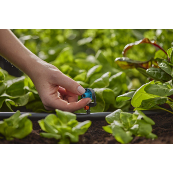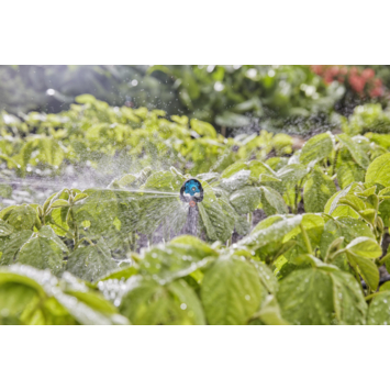 De 6-in-1 sproeikop van GARDENA geeft u alle mogelijkheden voor flexibele tuinirrigatie. Hij combineert de sterke punten van meerdere sproeikoppen en kan met zijn zes verschillende sproeipatronen individueel worden aangepast aan de behoeften van uw tuinplanten. Het mondstuk verspreidt een fijne sproeinevel en geeft groenten, bloemen of zaailingen betrouwbaar water. Naast een instelbare bewateringshoek van 90°, 180°, 270° of 360° kunt u gebruik maken van de functies van een Micro Strip Sprinkler en Endline Micro Strip Sprinkler. Dit maakt het mogelijk om lange, smalle zones in slechts één of twee richtingen te bespuiten. Ten slotte bepaal je met de draaiknop het straalbereik. De installatie van het onderdeel Micro-Drip-System op de 13 mm aansluitleiding is eenvoudig en gemakkelijk te doen door gaten te ponsen met behulp van het montagegereedschap of door gebruik te maken van de T-verbinding voor sproeikoppen. Met de verlengbuis voor sproeikoppen (art.nr. 13326-20) kunt u de positie van de 6-in-1 sproeikop op elk moment verhogen om uw tuinplanten ook na een groeispurt van bovenaf te blijven besproeien. De afsluitklep (art.nr. 13207-20) zorgt ervoor dat de waterstroom wordt geregeld en dat afzonderlijke delen van de aansluitleiding kunnen worden afgesloten. Dit resulteert in een optimale, waterbesparende beregening. U kunt het sproeipatroon direct op de sproeikop zien dankzij het intuïtieve ontwerp, dat alle GARDENA Sproeikoppen duidelijk van elkaar onderscheidt. Micro-Drip-systeem. Verzorging van uw planten en elke kostbare druppel. Gemakkelijke, nauwkeurige, water- en tijdbesparende irrigatie.
