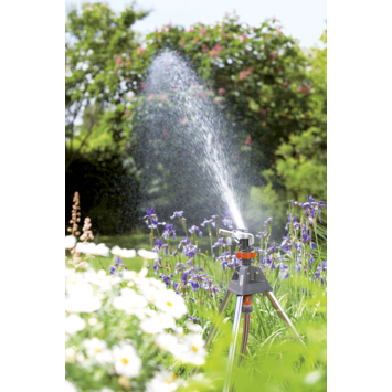 Wil je zonder moeite grote stukken tuin besproeien? Deze pulserende hoogtesproeier staat stevig op zijn inklapbare statief van 100 cm en geeft precies water waar jij dat wilt. Dankzij het instelbare bereik van 5 tot 12,5 meter besproei je oppervlaktes van 75 tot 490 vierkante meter. De sproeikop laat zich eenvoudig draaien en afstellen. Met de stelringen bepaal je de sproeihoek, van een smalle 25° tot een volledige 360°. Handig als je alleen een border of juist een hele cirkel wilt besproeien. De combinatie van metaal en kunststof maakt de kop stevig en betrouwbaar. De koperen spuitmond zorgt voor een precieze waterstraal, zonder verspilling. Je draait de sproeikop vast op een schroefdraad van 21 mm (G 1/2).
