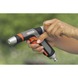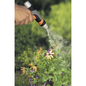 Robuuste metaal/kunststof spuitpistool. Waterdoorvoer traploos regelbaar. Impulsgreep met vastzetknop.