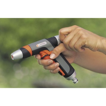 Het Gardena Premium metalen spuitpistool is een luxe sproeikop met een modern en aantrekkelijk design. Het spuitpistool is gemaakt van metaal en kunststof en heeft een softgrip handgreep zodat je hem comfortabel kan gebruiken en hij niet wegglijdt. De waterstraal is traploos regelbaar van volle straal tot fijne sproeinevel. Ook de hoeveelheid water kan je naar behoefte doseren. De ergonomische impulsgreep kan je vastzetten zodat je kan sproeien zonder dat je de knop ingedrukt hoeft te houden. Het Gardena Premium metalen spuitpistool is een ergonomische en robuuste waterspuit met een knap design.
