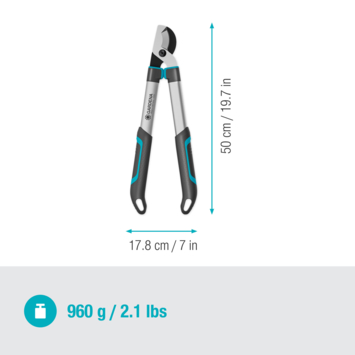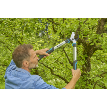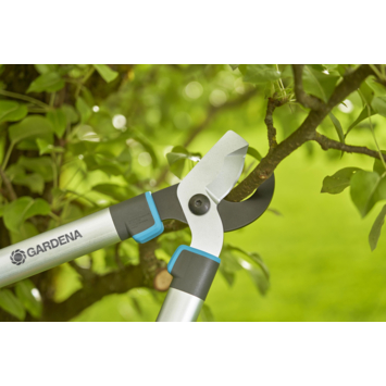 Sterke prestaties - eenvoudig te hanteren, de slimme oplossing voor krachtig snoeien. Met hoogwaardige precisiegeslepen stalen messen met PowerCoating, een snoeidiameter van 45 mm, een lengte van 500 mm en een lichtgewicht ergonomisch ontwerp maakt de EasyCut S takkenschaar van GARDENA korte metten met verse takken van jong hout. Krachtige snoeikracht De GARDENA Takkenschaar EasyCut S heeft precisiegeslepen messen van kwaliteitsstaal en maakt gebruik van hefboomwerking voor een krachtige snoeikracht en minder belasting voor de gebruiker bij het knippen van verse takken. Intuïtieve ergonomie Deze compacte GARDENA Takkenschaar EasyCut S met bypass-snede is ergonomisch ontworpen en licht van gewicht met slechts 900 g. Dit komt door de aluminium handgrepen en ergonomische ovale buizen voor comfortabel en moeiteloos snoeien van jong hout. Nette en precieze sneden De precisiegeslepen messen van hoogwaardig staal zorgen voor een schone en precieze bypass-snede. Hierbij passeren beide messen elkaar in een schaarachtige snede, waardoor een grotere precisie mogelijk is en de tak zo min mogelijk wordt gekneusd en geplet, wat ideaal is voor vers jong hout. De soepel lopende scharnierverbinding zorgt voor een nette snede en een soepele actie bij het snoeien van takken van vers hout. De messen zijn behandeld met GARDENA's PowerCoating. Hierdoor zijn ze beschermd tegen corrosie, eenvoudig schoon te maken en snoeien ze efficiënter dankzij minder wrijving. Langdurige scherpte De precisiegeslepen messen van deze GARDENA Takkenschaar EasyCut S worden in Duitsland gemaakt volgens de hoge normen van GARDENA en zijn ontworpen voor een langdurige scherpte en snoei-efficiëntie en voor een lange levensduur zonder zorgen.