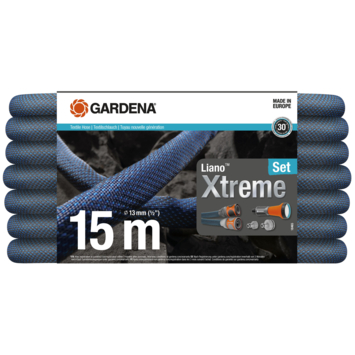 De Textielslang Liano™ Xtreme 15 m Set van GARDENA is meteen klaar voor gebruik. De duurzame Liano™ Xtreme is geschikt voor kleinere tuinen. Gebruik hem voor dagelijkse klusjes, maar ook voor uitdagende en langdurige bewatering. De set bestaat uit de 15 m lange slang met een diameter van 13 mm (1/2"), de voorgemonteerde Original GARDENA System-onderdelen: het Liano™ Slangstuk, de Liano™ Waterstop, twee Kraanstukken en een Sproeibroes. Een van de kraanstukken bevat een reduceerstuk, zodat je hem kan gebruiken voor in totaal drie verschillende kraanmaten. De slang bestaat uit een zeer flexibele PVC-binnenslang met optimale prestaties, terwijl de innovatieve buitenslang gemaakt van extreem duurzaam textiel de Liano™ Xtreme een lange levensduur geeft. Dankzij zijn buitengewone eigenschappen is de innovatieve Liano™ Xtreme speciaal ontworpen voor uitdagende tuinsituaties. Hij is zeer stevig, vuilafstotend en kan makkelijk tegen ruig terrein zoals keien, rozendoorns of slepen langs huismuren. Dankzij zijn uitstekende flexibiliteit is de tuinslang makkelijk over de grond te trekken en knikt hij niet. Daarnaast is zijn aangename oppervlak comfortabel in gebruik. Nog een voordeel van de Liano™ Xtreme is zijn tot wel 50% lager gewicht ten opzichte van gebruikelijke PVC-slangen. Dit maakt bewatering met de slang makkelijk, zelfs na langere tijd. De flexibiliteit van de Liano™ Xtreme laat je hem ook op een ruimtebesparende manier opslaan, doordat hij ideaal aan te passen is aan de beschikbare opbergruimte. De slang is bestand tegen een maximale druk van 35 bar. Dankzij de uv- en vorstbestendigheid kan hij het hele jaar door buiten blijven. De Liano™ Xtreme is vrij van schadelijke stoffen zoals ftalaten (<0,1%), maar ook cadmium, lood en barium (<0,1%). Het kwaliteitsproduct de Textielslang Liano™ Xtreme is gemaakt in Europa en ondersteund door GARDENA met een fabrieksgarantie van 30 jaar als je hem binnen 3 maanden na aankoop registreert via gardena.com/registration. Ontwikkeld voor het extreme. Ontworpen voor het alledaagse. Liano™ Textielslangen.