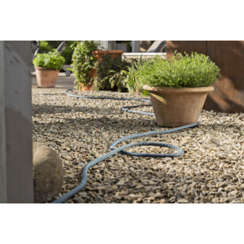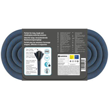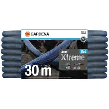 De Textielslang Liano™ Xtreme 30 m Set van GARDENA is ideaal voor de langdurige en veeleisende bewatering van je grote tuin. De gebruiksklare set bestaat uit de 30 m lange Liano™ Xtreme met een diameter van 13 mm (1/2"), de voorgemonteerde Original GARDENA System-onderdelen: het Liano™ Slangstuk, de Liano™ Waterstop, twee Kraanstukken en een Reinigingspistool. Eén van de twee kraanstukken bevat een geïntegreerd reduceerstuk, zodat je de textielslang kan aansluiten op drie verschillende kraangroottes. De stevige Liano™ Xtreme valt op met zijn zeer flexibele PVC-binnenslang en de innovatieve buitenslang, gemaakt van extreem bestendig textiel. Deze combinatie zorgt voor uitstekende prestaties, flexibiliteit en duurzaamheid. De tuinslang is stevig en vuilafstotend en is klaar voor iedere uitdaging. Je kan de Liano™ Xtreme gemakkelijk verplaatsen, omdat hij niet knikt of blijft haken. De textielslang overwint ruig terrein zoals keien, rozendoorns of slepen langs ruwe muren. Dankzij zijn aangename textuur ligt hij comfortabel in de hand. Daarnaast is de Liano™ Xtreme tot wel 50% lichter dan conventionele PVC-slangen. Dit is bijzonder handig in een grote tuin en tijdens langere bewateringssessies. Dankzij zijn elasticiteit kan je de textielslang ruimtebesparend opbergen op de plank of in de garage, want hij past zich aan aan de beschikbare opbergruimte. De barstdruk van de slang is 35 bar. Dankzij de uv- en vorstbestendigheid kan de Liano™ Xtreme het hele jaar door gebruikt worden, ongeacht de weersomstandigheden. Hij is bovendien vrij van schadelijke stoffen zoals ftalaten (<0,1%), maar ook cadmium, lood en barium (<0,1%). De Textielslang Liano™ Xtreme is een kwaliteitsproduct dat is ontwikkeld in Duitsland en GARDENA geeft er 30 jaar fabrieksgarantie op na registratie op gardena.com/registration binnen 3 maanden na aankoop. Ontwikkeld voor het extreme. Ontworpen voor het alledaagse. Liano™ Textielslangen.