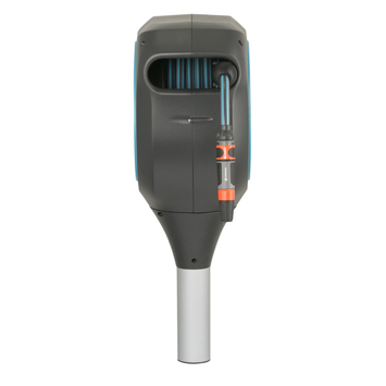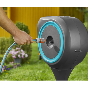 De slangenbox RollUp M van GARDENA biedt niet alleen een veilige en ruimtebesparende opslag voor uw tuinslang, maar u zult ook blij zijn met de moeiteloze bewatering van uw middelgrote tuin. De handige slangenbox wordt in de grond verankerd met een stevige standaard op een plek naar keuze in een bloembed of op het gazon. Met behulp van een bevestigingsstang kunt u de metalen pen nog eenvoudiger in de grond schroeven. Voor gebruik trekt u de 20 meter lange slang uit tot de gewenste lengte en kunt u meteen beginnen met bewateren. Dankzij de ingebouwde korte vergrendelingspunten is het hanteren van de tuinslang eenvoudiger dan ooit: zodra u stopt met de slang, wordt de vergrendeling automatisch vastgezet op de gewenste slanglengte. Het innovatieve ontwerp kan 360 graden worden gedraaid, voor maximale flexibiliteit bij het bewateren van de tuin. De box volgt altijd uw bewegingen, zodat u elke hoek van uw tuin gemakkelijk kunt bereiken zonder dat de tuinslang knikt of in de knoop raakt. Bovendien bespaart u met deze slangenbox vermoeiend opwikkelen en oprollen en hebt u geen last van vuile handen: door kort aan het uiteinde van de slang te trekken, wordt de vergrendeling ontgrendeld en wordt de tuinslang dankzij een geïntegreerde stalen veer volledig automatisch en betrouwbaar opgerold. De box heeft een praktische slanggeleider die de slang op zijn plaats houdt, zodat er geen blokkades of knopen optreden. De innovatieve RollControl-technologie zorgt voor veilig, gecontroleerd en moeiteloos oprollen zonder dat de slang in de war raakt. Het hoogwaardige materiaal is bestand tegen UV en vorst, heeft een lange levensduur en is onderhoudsvrij. De box is zeer compact en stijlvol ontworpen, zodat deze eenvoudig in elke tuin kan worden geïntegreerd. Hij is bovendien afgesteld op de hoogte van de GARDENA robotmaaiers, zodat het gazon rond de slangenbox altijd wordt onderhouden en gemaaid. De slangenbox wordt geleverd met een flexibele aansluitslang, alle benodigde montageonderdelen, de Original GARDENA System elementen en een sproeier met twee verschillende sproeipatronen. GARDENA geeft vijf jaar garantie op de slangenbox RollUp M. Bewatering die altijd gebruiksklaar is.