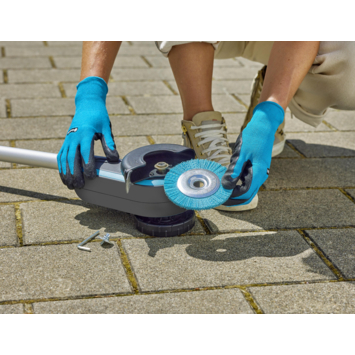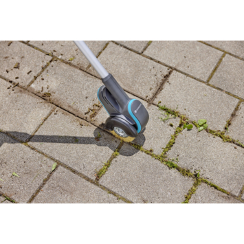 De stalen voegenborstel is geschikt voor robuuste oppervlakken en smalle voegen. Voor krasgevoelige oppervlaktes wordt het gebruik van een apart verkrijgbare nylon voegenborstel met zachtere haren aanbevolen. De accu-voegenborstel EasyWeed 1800 biedt een individuele snelheidsregeling, waardoor gevoelige plekken voorzichtig kunnen worden gereinigd met minder borstelomwentelingen. Wanneer meer kracht nodig is, kan hij tot 1.800 tpm gaan. Het LED-display op het handvat toont de resterende acculading. De benodigde 18 volt systeemaccu's zijn gebaseerd op Bosch-technologie en zijn compatibel met diverse andere tuingereedschappen van GARDENA en ook met producten van andere fabrikanten in de POWER FOR ALL alliantie.